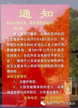 日前,我院眼科携手渭南四号信箱医院开始为本市辖区内,年满65周岁的常住居民提供免费体检,本市户籍人员持身份证、非户籍人员持居住证,方可到四号医院领表进行免费体检。