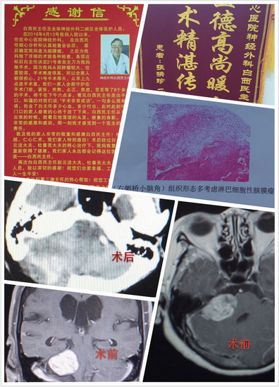 患者张某,女,67岁,于4月13日入院神经外科二病区。患者自诉头晕2月,加重1周,行颅脑CT及MR提示:右侧桥小脑角区肿瘤,考虑脑膜瘤或听神经瘤可能。入院后白西民主任医师高度重视,积极进行术前准备及讨论,反复与患者家属沟通,家属要求在我院手术治疗。4月21日,由白西民主任医师主刀,杜春亮主治医师、赵云洁住院医师配合在全麻下行右侧桥小脑角区肿瘤切除术,经过7小时32分钟努力,成功切除肿瘤。病理报告提示:淋巴细胞性脑膜瘤。