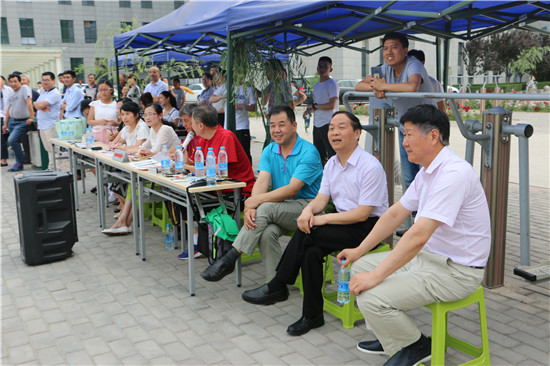 院长张进社(中间)、党委书记鲁海燕(左边)、工会主席施泰来(右边)在场下为队员们加油
