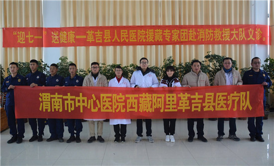 7月1日上午,在平均海拔为4500米的西藏阿里,MILAN.COM医疗援藏队与革吉县医院医护人员一起,为当地消防官兵进行义诊。