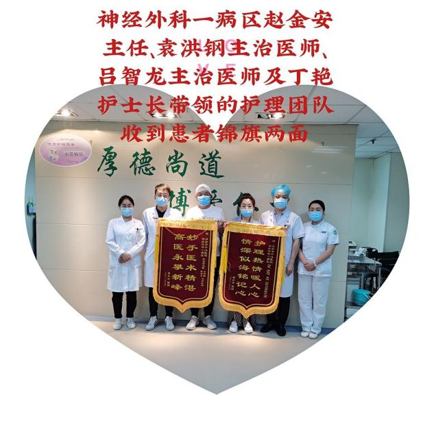 2021年9月24日,一位患者手捧着两面绣着“妙手医术精湛 高医勇攀新峰”“护理热情暖人心 情深似海铭记心”的锦旗来到神经外科一病区,将锦旗送到了科室的医护人员手中,紧紧握着医生、护士的手,久久不肯放下,口中不住的念着:“感谢医生,感谢护士,谢谢,谢谢!”