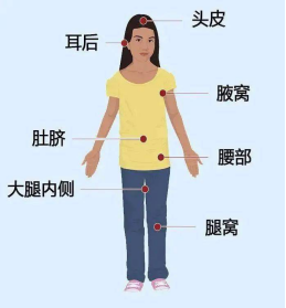 蜱常附着在人体的头皮、腰部、腋窝、腹股沟及脚踝下方等部位,一旦发现有蜱已叮咬皮肤,不要生拉硬拽,以免拽伤皮肤,或将蜱的头部留在皮肤内。