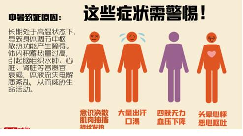 当您出现以下情况时,请警惕已患热射病:健康年轻人(如参加训练的官兵),在高温高湿环境下进行高强度训练或从事重体力劳动一段时间后忽感全身不适,发热、头痛、头晕、反应迟钝,或忽然晕倒、神志不清,伴恶心、呕吐、呼吸急促等,继而体温迅速升高达40℃以上,出现神志模糊。皮肤干热,面色潮红或苍白,开始大汗、冷汗,继而无汗,心动过速、休克等情况。年老、体弱和有慢性疾病的患者,一般前驱无特殊表现,1—2d后症状加重,出现神志模糊、昏迷等,或大小便失禁,体温高,可达40~42℃等情况。