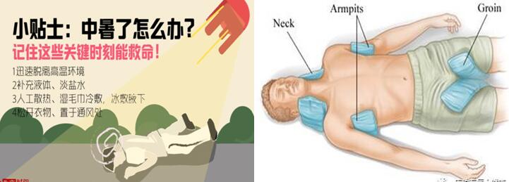 若有中暑症状时,救护办法为:1)立即将病人移到通风、阴凉、干燥的地方,如走廊、树荫下;2)让病人仰卧,如果有外衣立即脱掉;3)尽快冷却体温,降至38度以下。具体做法有用冰袋(或凉湿毛巾)冷敷头部、腋下以及腹股沟等处,因为这些地方的血管靠近皮肤表面,容易把降了温的血带回患者的内脏;4)意识清醒的病人或经过降温清醒的病人可饮服绿豆汤、淡盐水等解暑;5)还可服用人丹和藿香正气水。另外,对于重症中暑病人,要立即拨打120电话,求助医务人员紧急救治。