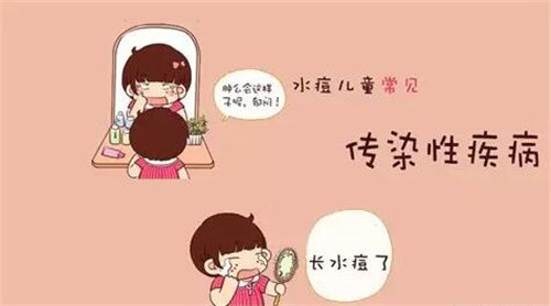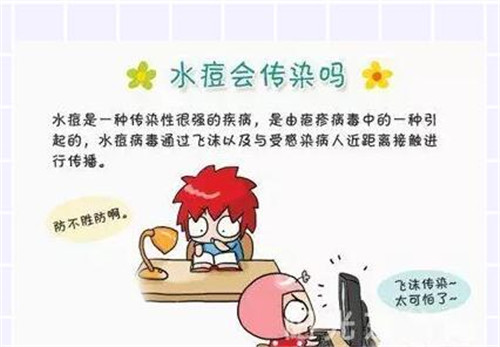 间接接触 患者在打喷嚏、呼气时,将带有水痘病毒的飞沫播散到空气中,健康人吸入后就会被感染。水痘患者的大部分皮疹为薄壁水疱,很容易破裂。带有水痘病毒的疱液会污染床单、被褥、枕头、内衣,水痘病毒虽然在外界环境中存活能力很弱,但健康人的皮肤接触了被污染的衣物,也会被感染上水痘病毒;或者接触了被水痘病毒污染的尘土、用具,也有可能被感染上水痘病毒。