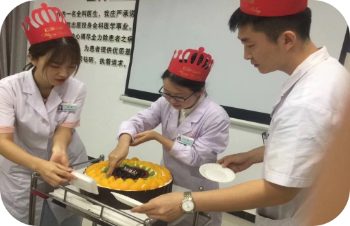 3.人文关怀:医院高度关注医学人文和思想品德教育。成立专门住培医师党支部,定期召开支部生活会;住培医师参加基层卫生院健康扶贫、义诊、授课等活动;开展丰富的学科知识竞赛,如:精品病例分享大赛、实践技能竞赛;鼓励住培医师参与院内外学术讲座和省市技能竞赛;定期组织各类文体活动,加强团队建设、丰富业余生活。