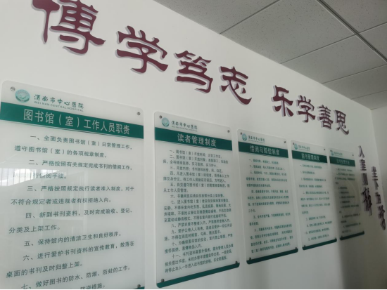 我院图书馆成立于2020年,位于我院行政楼一楼东侧的临床技能培训中心内。建面约60平方米,配备多个阅览座位。管内设有图书借阅处。
