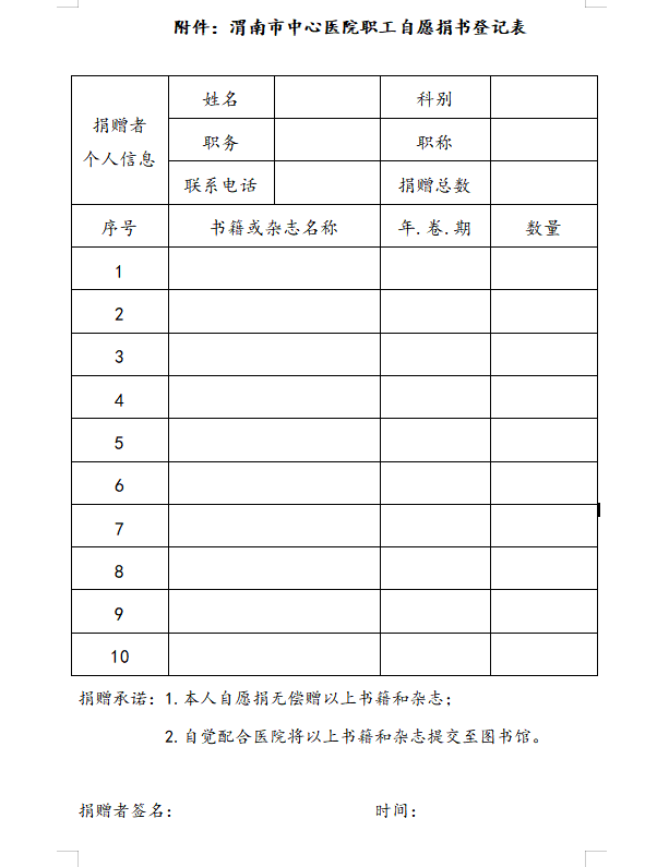 我院图书馆长期接受社会各界书籍捐赠。联系电话:0913-2168239 联系人:科研教学科。捐赠登记表(详见附件)。
