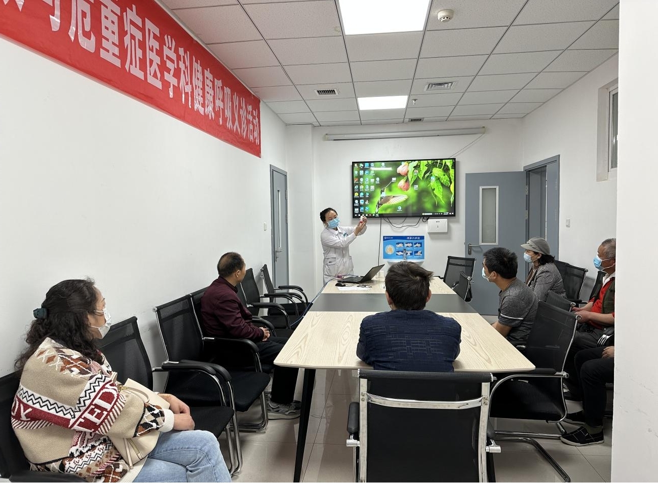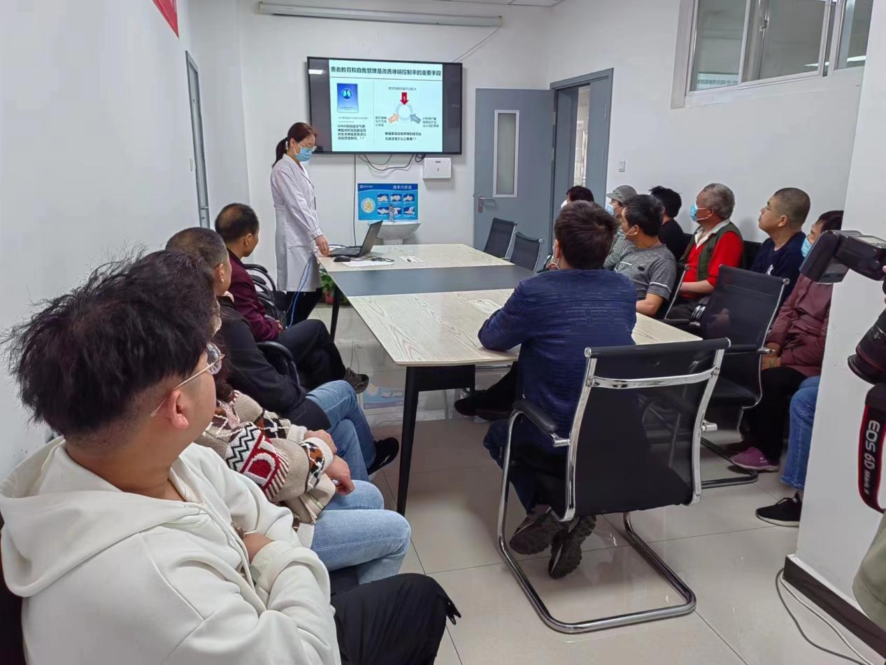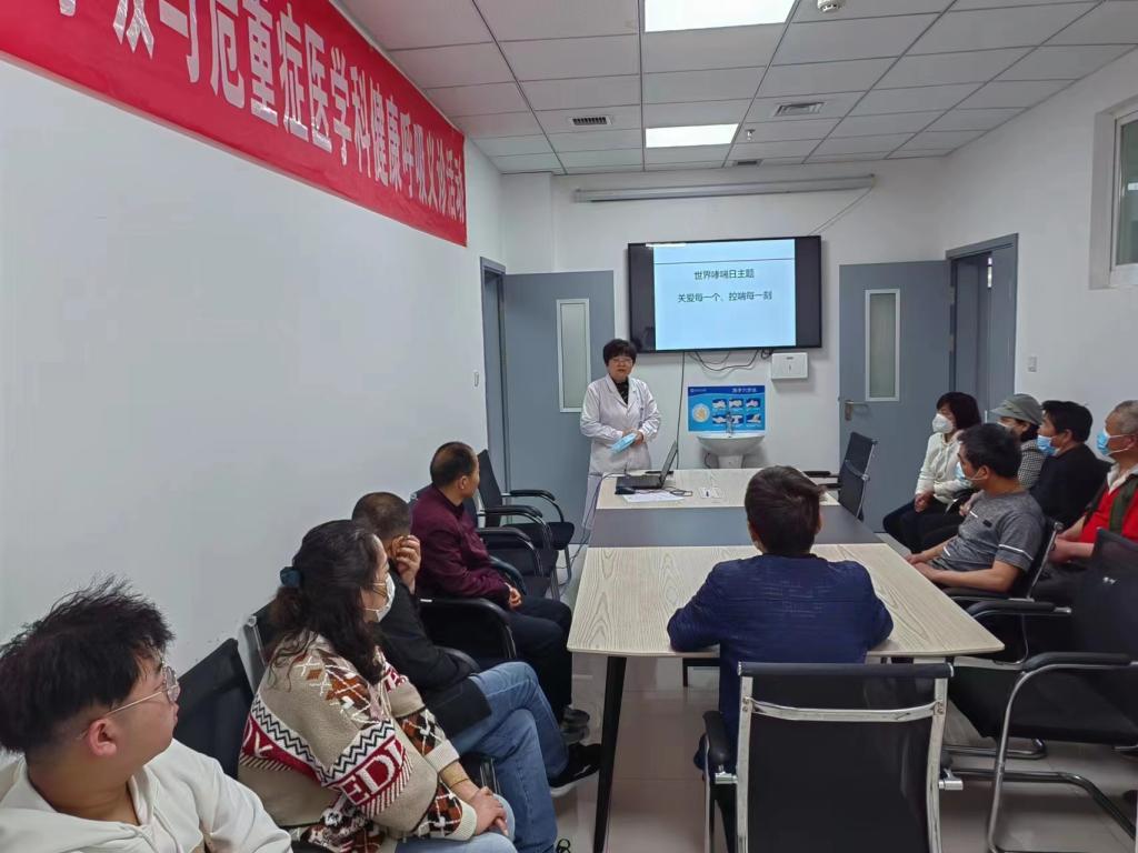 10点30分,在二部四楼MILAN.COM的会议室,坐满前来听课的患者及家属。传锋彬主任医师分享《哮喘的防治和误区》,消除大家对‘哮喘治不好,治也没用’的误区,通过正确有效的治疗,可使患者避免哮喘急性发作,像健康人一样生活工作,树立战胜疾病的信心;吕凌主任医师在《哮喘的自我管理中》教会患者怎样自我评估和如何病情监测,让患者在掌握一门技术的情况下更加有底气面对哮喘;马珍主管护师利用吸入装置模具,亲身示范讲解每一种吸入药物的方法及吸入过程中的注意事项,在座患者都表示受益颇多。讲座最后,由主管护师南晨在病房带领大家进行呼吸操锻炼,现场大家热情高涨。