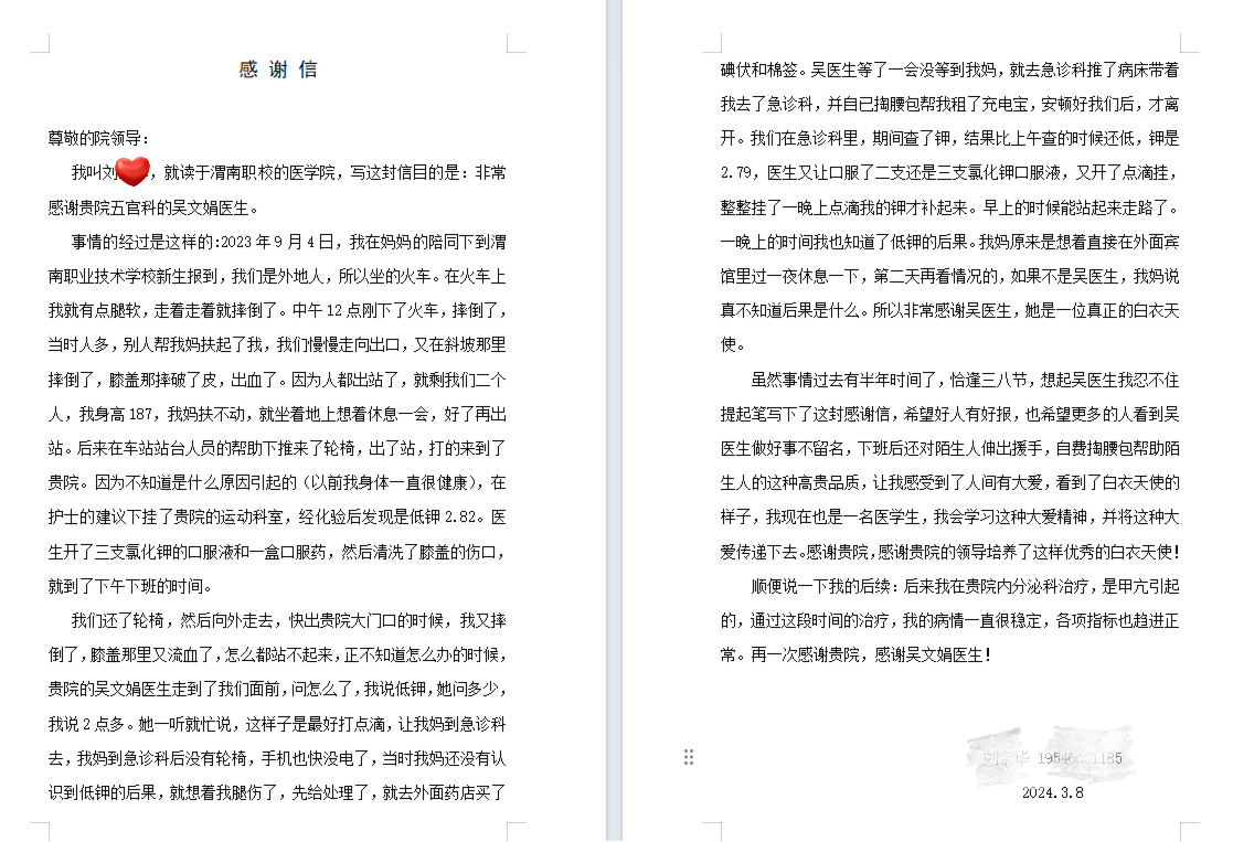 这封感谢信恰逢妇女节发来的。信中这样表达,吴文娟护士让他感受到了人间有大爱,让他看到了白衣天使的样子,作为一名医学生,他会学习这种大爱精神,也会将这种爱传递下去。