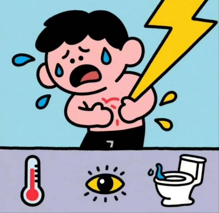 2. 发烧 + 黄疸:结石堵胆管,胆汁逆流致发炎,皮肤、眼睛变黄 。