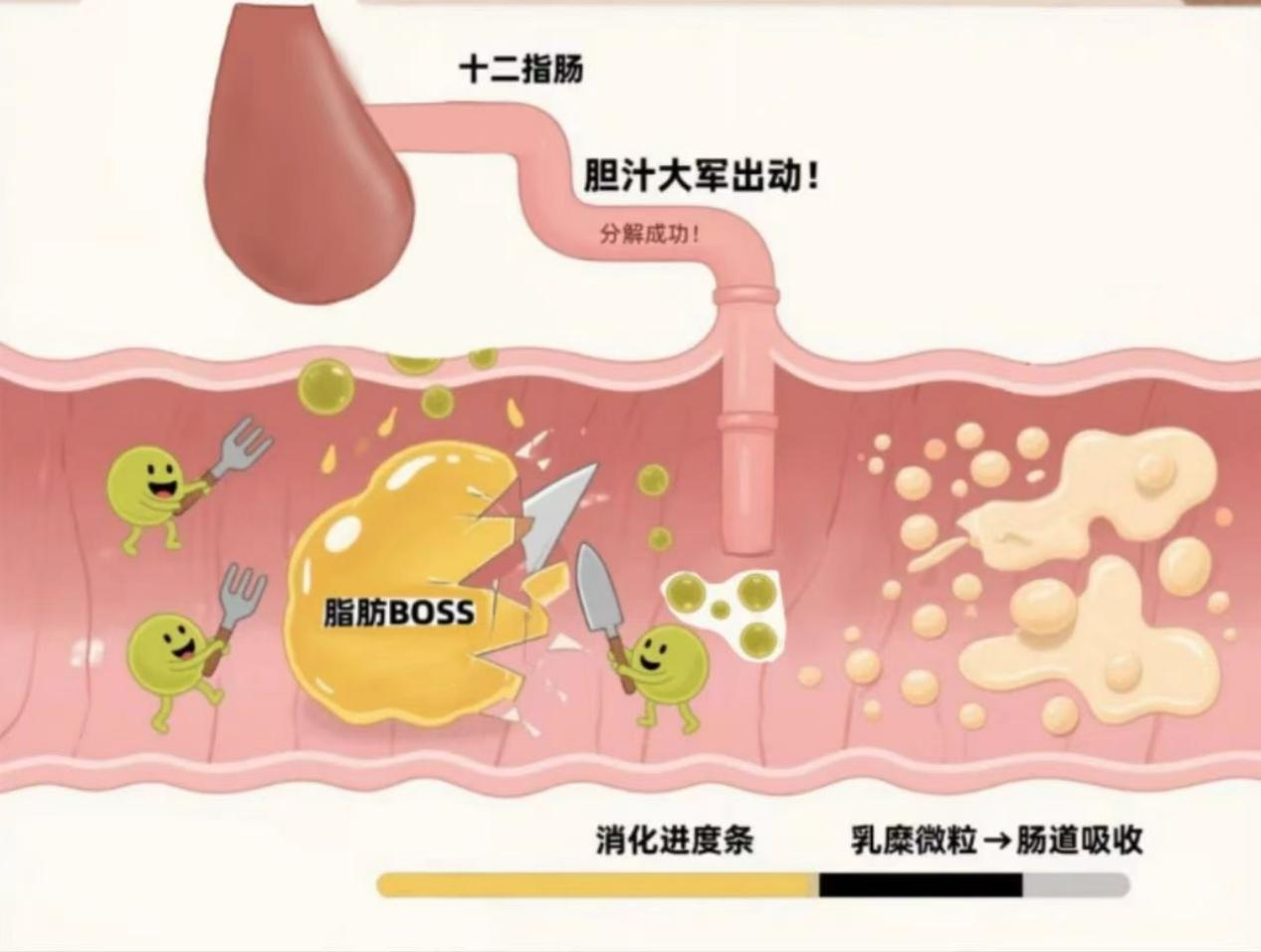 1. 胆盐就像厨房中的超级“乳化大师”,挥舞着魔法棒,将大块脂肪拆解成细小的油滴,就像洗洁精瓦解油污般轻松,助力肠道高效吸收营养。