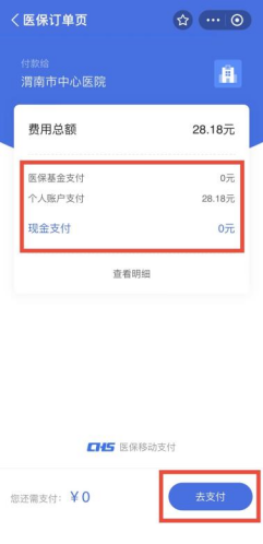 在结算页面可看到费用总额、个人账户支付、医保统筹基金支付以及自费金额等结算信息。