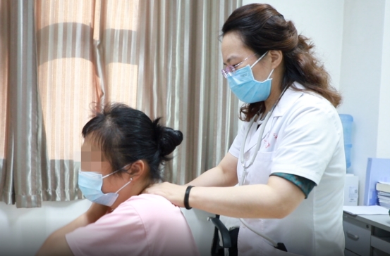 图为刘燕为一位乏力、头晕身体不适的患者进行查体。