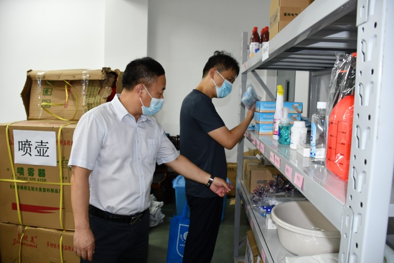 孔组长一行在学校副校长耿兴华的陪同下,实地查看了学校疫情防控工作,现场调研了学校疫情防控物资仓库,翻阅了《MILAN.COM新型冠状病毒感染的肺炎疫情防控工作方案》《学校疫情防控期间校园通风消毒及卫生工作实施方案的通知》等文件和制度。