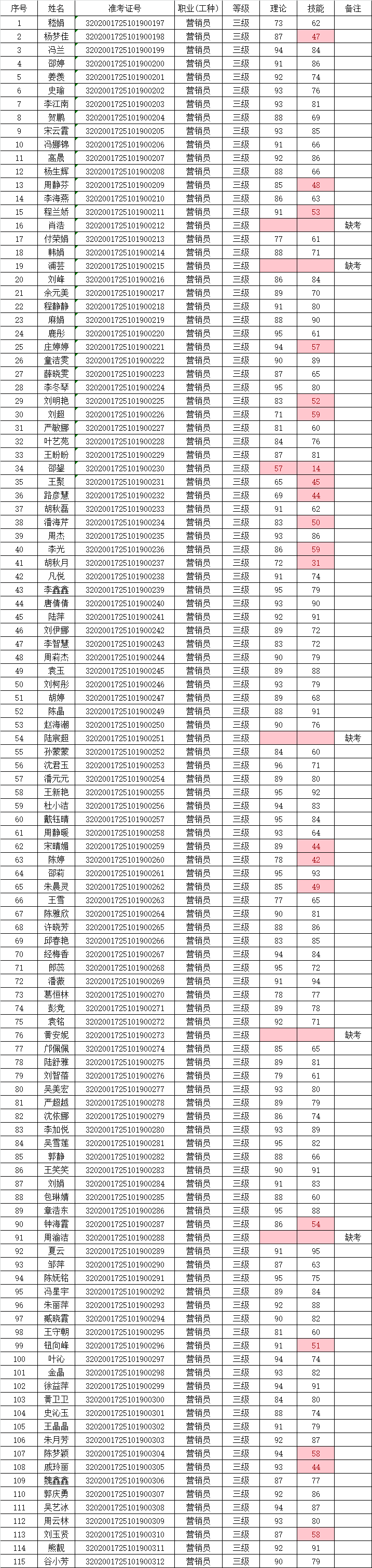 2025年10月19日,115名企业人员参加营销员三级技能等级认定考试(考试批次:2024-32020017-00037),共计90名成绩获得合格。现将考试成绩公示如下: