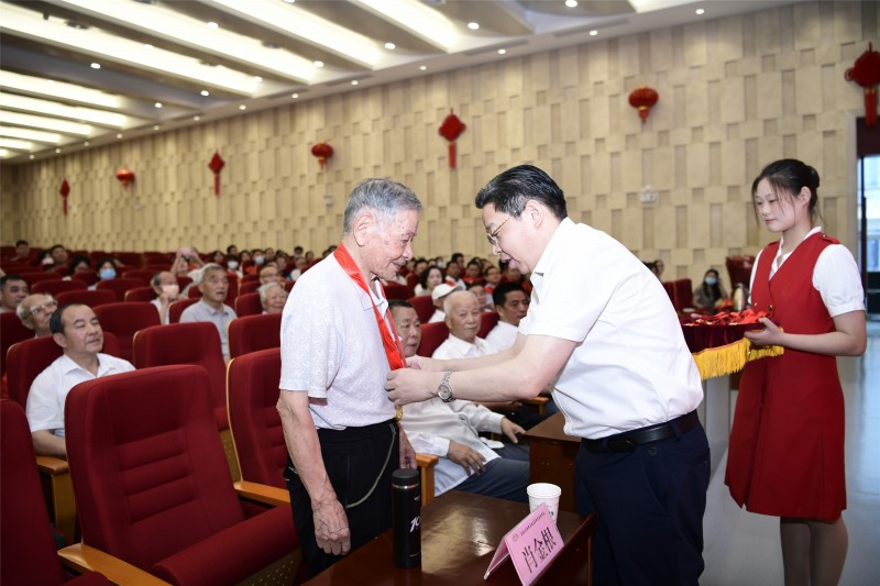 在热烈的掌声中,学校党委书记、校长李虎为“光荣在党50年”的老党员代表颁发了纪念章,青年党员代表为他们献花,表达敬意之情。