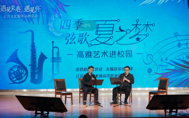 开幕式结束后,高雅艺术进校园活动拉开帷幕。无锡洛可可乐团的演奏家们为师生们带来一场精彩的管乐演奏表演,精彩的演出赢得全场师生的阵阵掌声与喝彩,现场感受高雅艺术的魅力