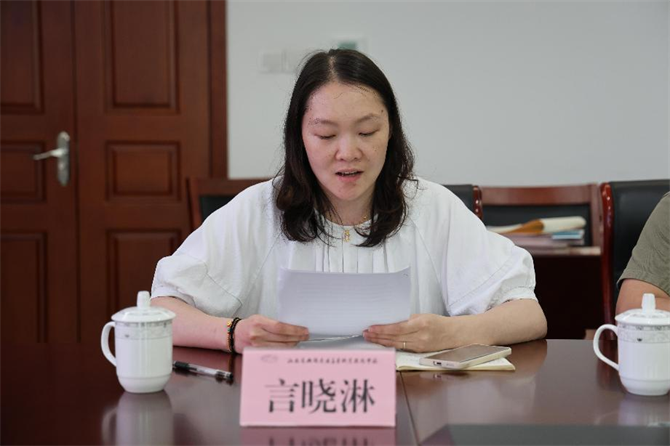 资助工作人员代表言晓淋老师发言,她介绍了奖助学金的评选过程,表示资助是一项有温度的工作,在帮助学生申请奖助的过程中也收获了很多幸福。