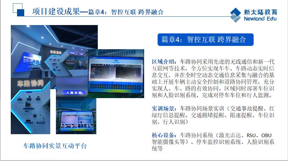 实训基地严格按照建设方案组织建设,精心施工,精益求精,追求卓越,已建成物联网关键技术实训室、智慧物流实训室、物联网综合应用实训室、智能交通实训室以及交通物联网技术综合展厅。综合展厅主要由开启智慧之路(综合可视化平台)、智融科技全数前行(智慧物流)、智控互联跨界融合(识别系统、智慧出行畅想生活(五峰山智慧大桥)、智能物联 创造无限(智慧路口)、智融智联智控慧行(智能快递)、智慧城市(交通大沙盘)、智慧护栏、智慧灯杆、文化长廊等部分组成,实训基地整体氛围极具现代科技感。