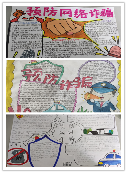 本次手抄报活动得到了广大同学的积极响应。活动中,同学们紧紧围绕主题,认真收集相关材料,将自己对“预防网络诈骗”的理解,各种有效防范措施,通过手抄报的形式展示出来,表现出同学们对网络诈骗的深恶痛绝和预防网络诈骗的深刻理解。经过学院认真点评,获奖名单如下: