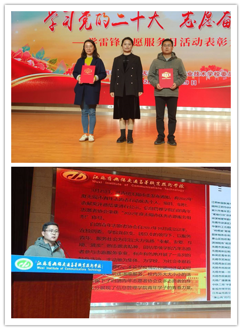 会上,学院团总支书记朱沛老师围绕信息管理学院学雷锋志愿服务月活动开展情况进行成果汇报。 “雷锋月”主题海报绘制活动、清洁宿舍卫生、主题黑板报比赛、电脑系统维修重装服务、勤新社区卫生清洁环保宣传志愿活动、助力2023无锡马拉松和阳山半程马拉松、赴颐乐居护理院送温暖等志愿活动。一组组照片、视频带大家回顾了信息学院三月学雷锋志愿服务的精彩瞬间。最后,经过评委评分,信息管理学院团总支凭借丰富多彩、形式多样的志愿活动获评“优秀组织单位”,会上还表彰了学雷锋志愿服务月“优秀志愿者”,其中信息管理学院共计十名同学获评,也是对学院一直以来各项志愿服务工作的认可,此次收获的不仅仅是一张证书,更是一份荣誉和激励。